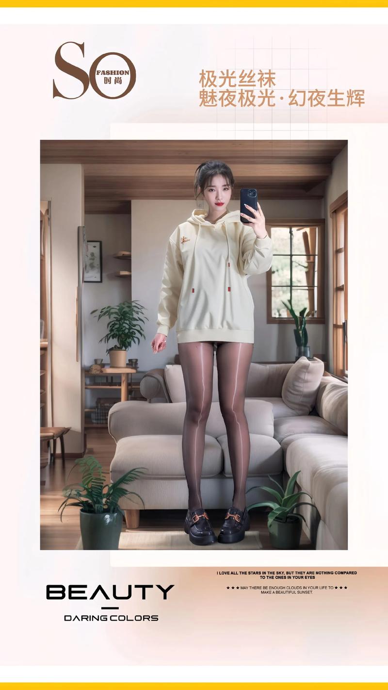 - 视觉反差感极强:宽松休闲的浅米色连帽卫衣,搭配带有明显光泽感的极光丝袜,形成了「慵懒随性」和「性感精致」的强烈对比,这种混搭风格本身就很吸睛。