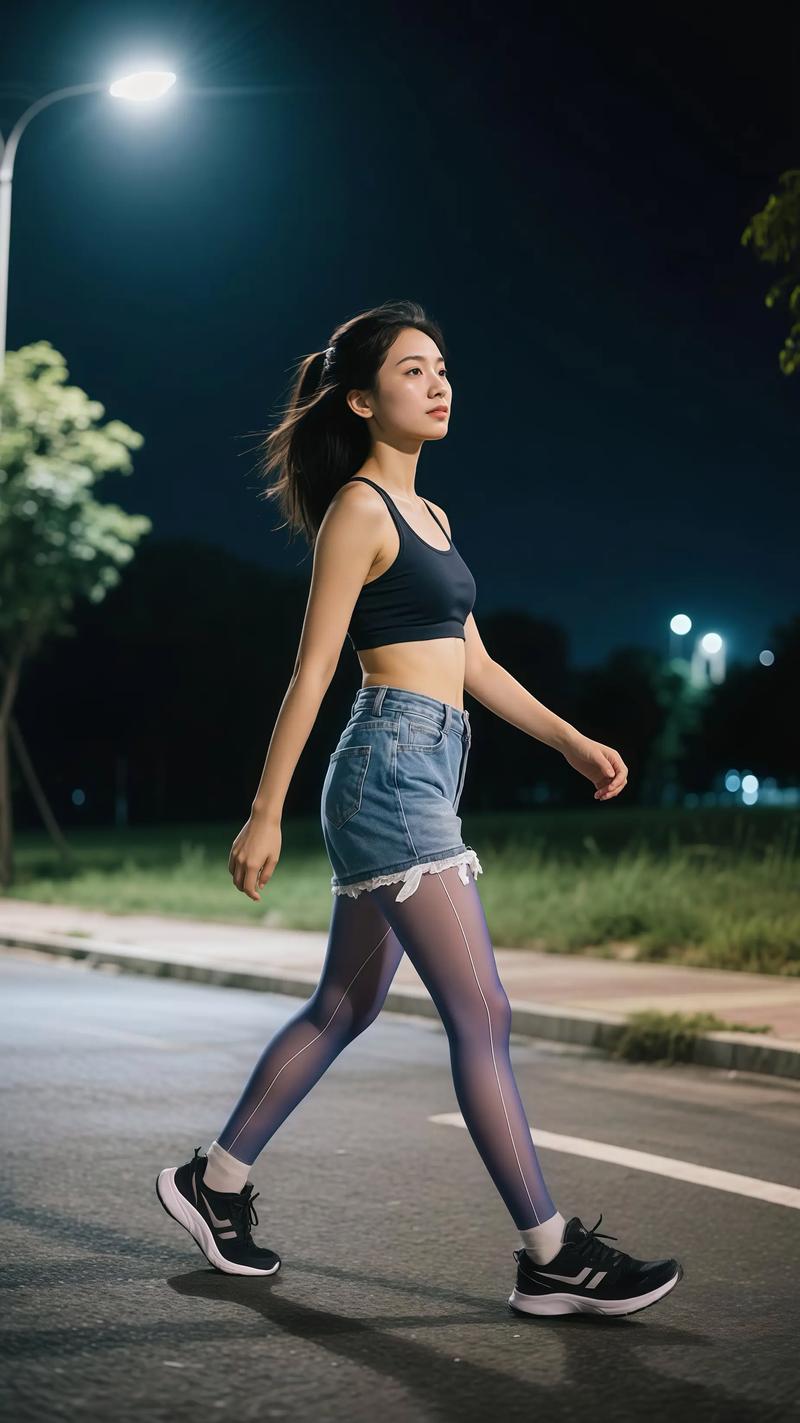 2. 身材线条突出:短款上衣+丝袜的组合,清晰展现了腰腹和腿部线条,在夜晚环境下更具视觉冲击力,容易成为路人目光的焦点。