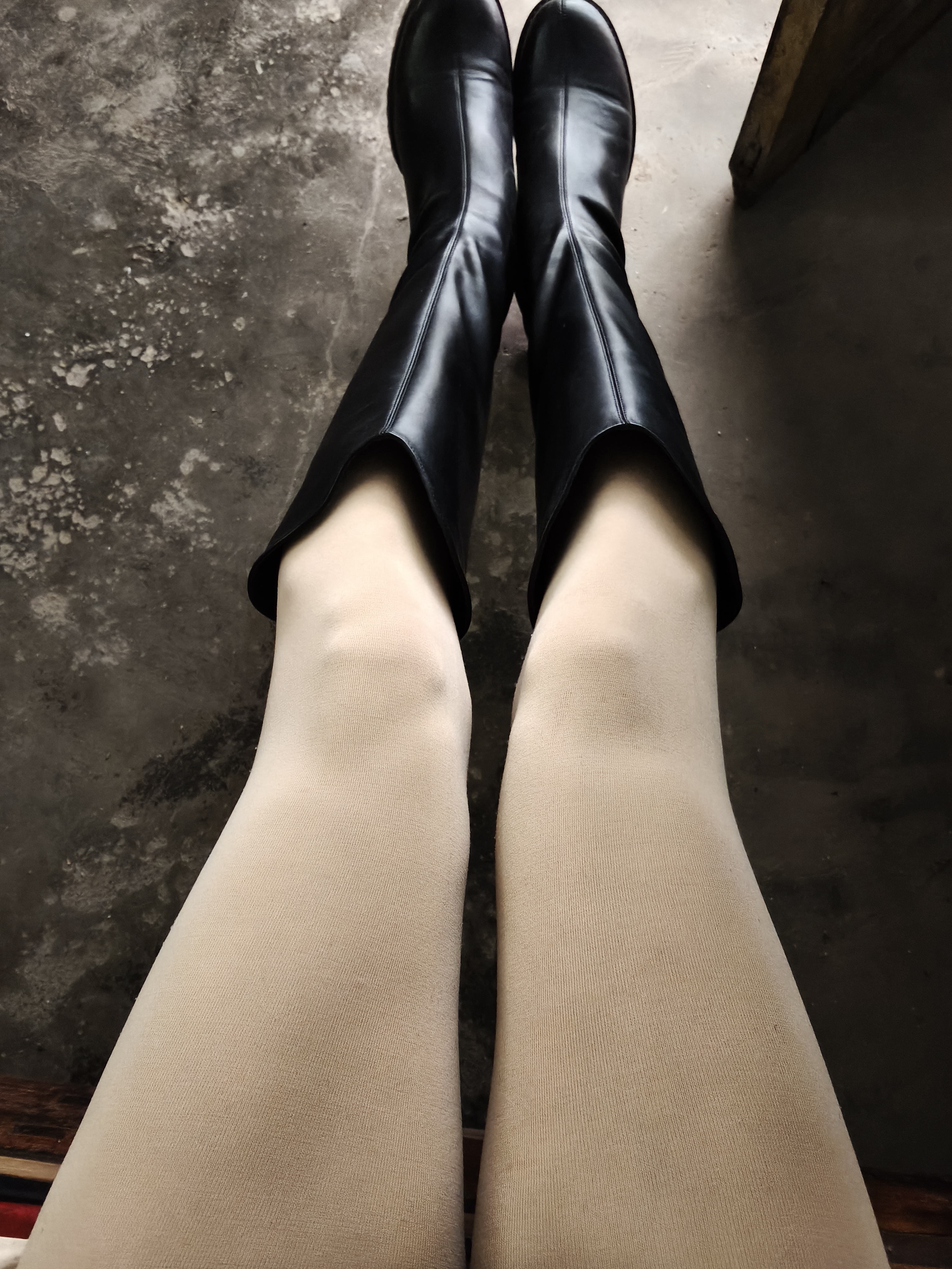 男士肉色超薄连体丝袜搭配黑色长筒靴